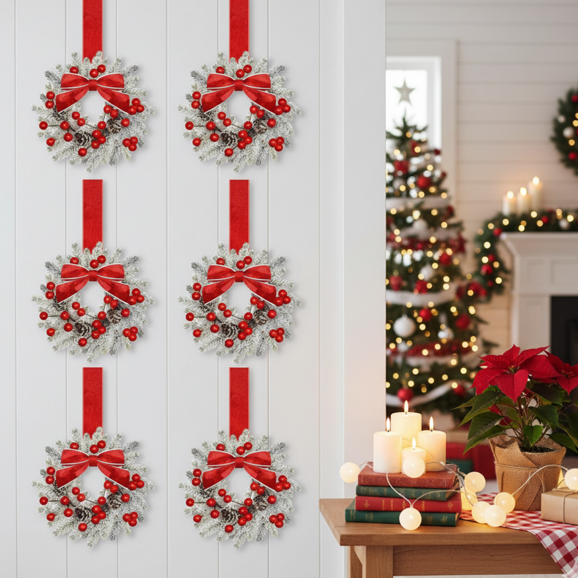 Meet your instant holiday look. Watch your home transform with this set of 6 mini wreaths, each featuring lush artificial greenery and elegant farmhouse ribbon bows. They're designed to add co-ordinated holiday charm to any space, from kitchen cabinets to dining chairs or windows.